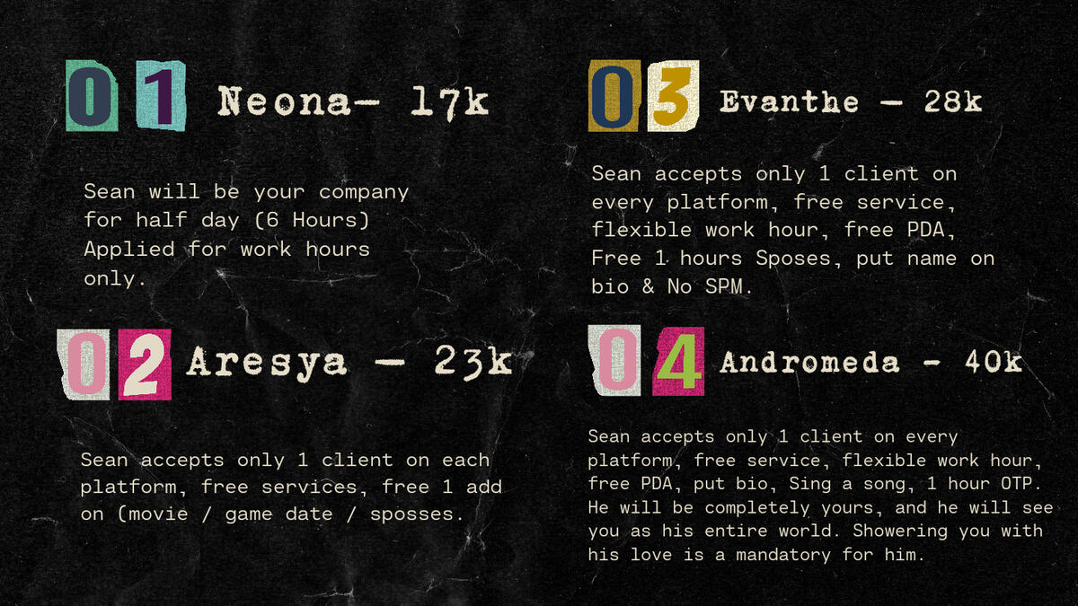 Bold of the clients to assume that Sean still has the real-life matters that he is obligated to do. Therefore, he might not be able to always be the fast-response one. The average time that Sean needs to reply to your text is between 5-40 minutes. Sean will let you know if he needs to go away for an extended period of time (AFK). Please get in touch with the manager and ask for your free extra hours if Sean no longer responds or informs you at all. Secret Code: 521