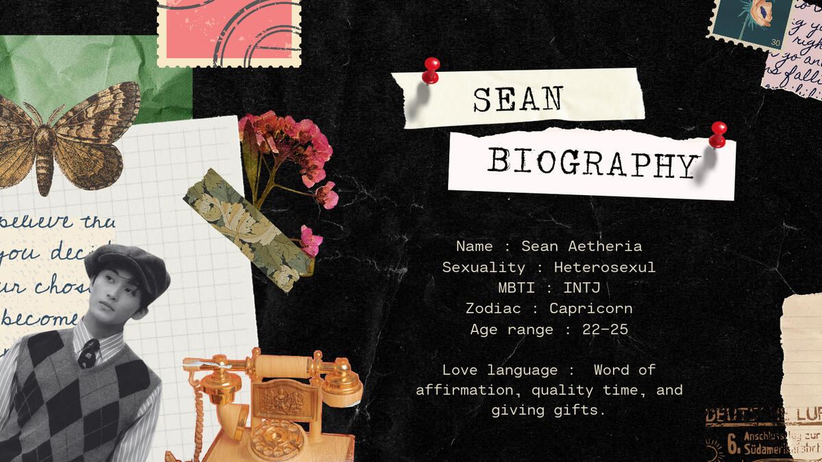 He enjoys giving his time for the one he loves, so he will make sure every second of the session is full of happiness. However, if there is something important to do in his real life, he would ask your permission to afk. Sean wraps his masculinity with a softness that makes your comfortable to rely on him. His way of loving you is shown by giving his unwavering loyalty, learning about you, taking pride in your accomplishments, protecting you, and deliberately choosing you over everything.